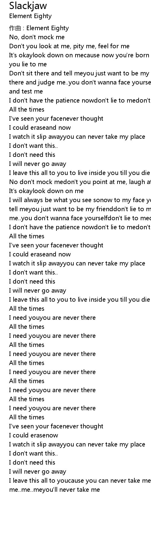 | I will always be what you see sonow to my face you lie to medon't sit there and tell meyou just want to be my frienddon't lie to medon't sit there and judge me..you don't wanna face yourselfdon't lie to medon't sit there and test me | |