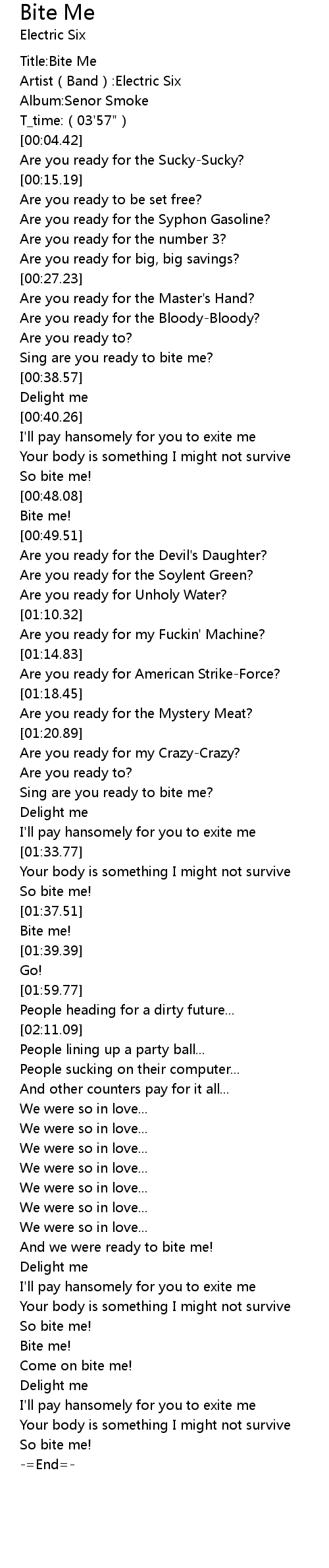 | [00:37.01] | Sing are you ready to bite me? |