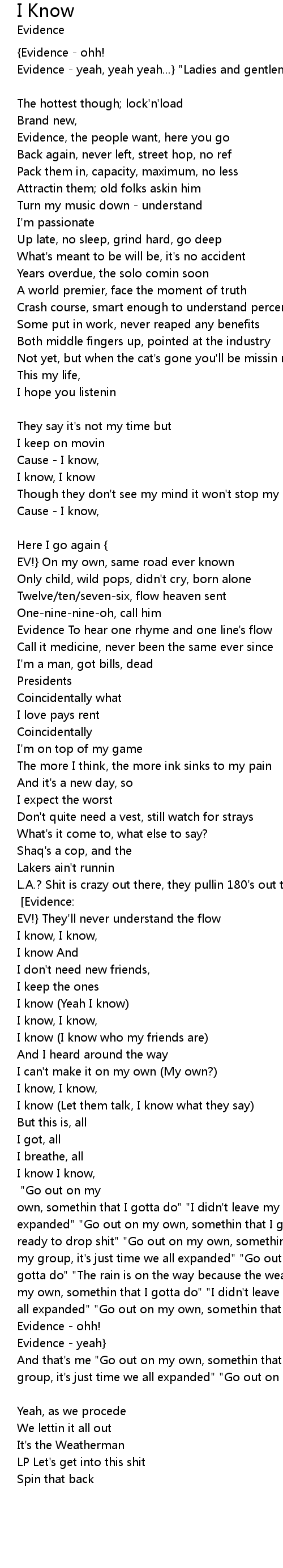 I know, I know (I don't know what else there is) [DJ Revolution:] "Go out on my own, somethin that I gotta do" "I didn't leave my group, it's just time we all expanded" "Go out on my own, somethin that I gotta do" "The Weatherman lands, ready to drop shit" "Go out on my own, somethin that I gotta do" "I didn't leave my group, it's just time we all expanded" "Go out on my own, somethin that I gotta do" "The rain is on the way because the weatherman predict it" "Go out on my own, somethin that I gotta do" "I didn't leave my group, it's just time we all expanded" "Go out on my own, somethin that I gotta do" {