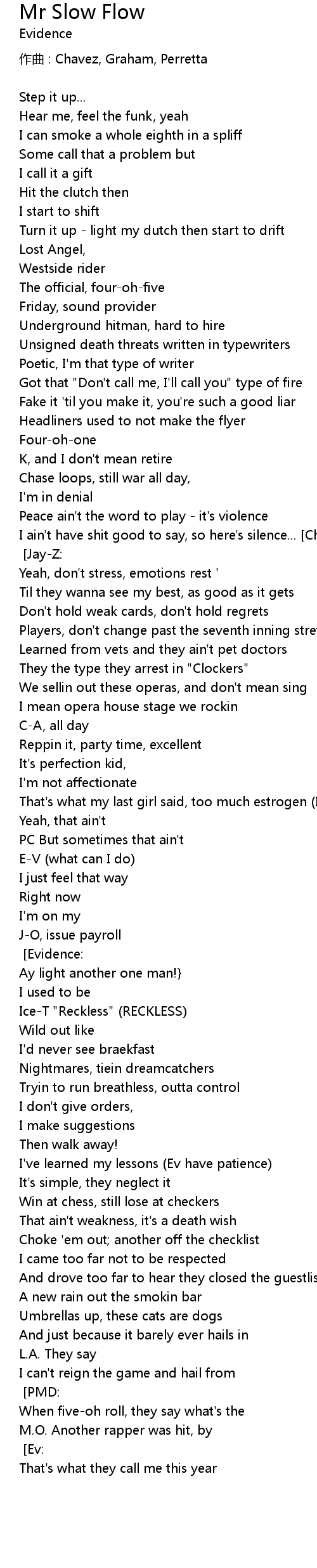 | I ain't have shit good to say, so here's silence... [Chorus: cuts by DJ Revolution] [Jay-Z:] "I slow flows y'all to death" [Evidence:] | |
