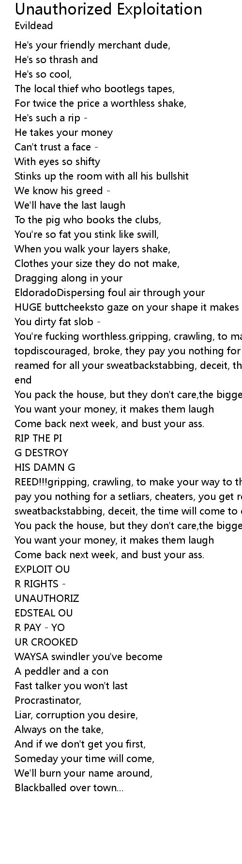You're fucking worthless.gripping, crawling, to make your way to the topdiscouraged, broke, they pay you nothing for a setliars, cheaters, you get reamed for all your sweatbackstabbing, deceit, the time will come to change the end |