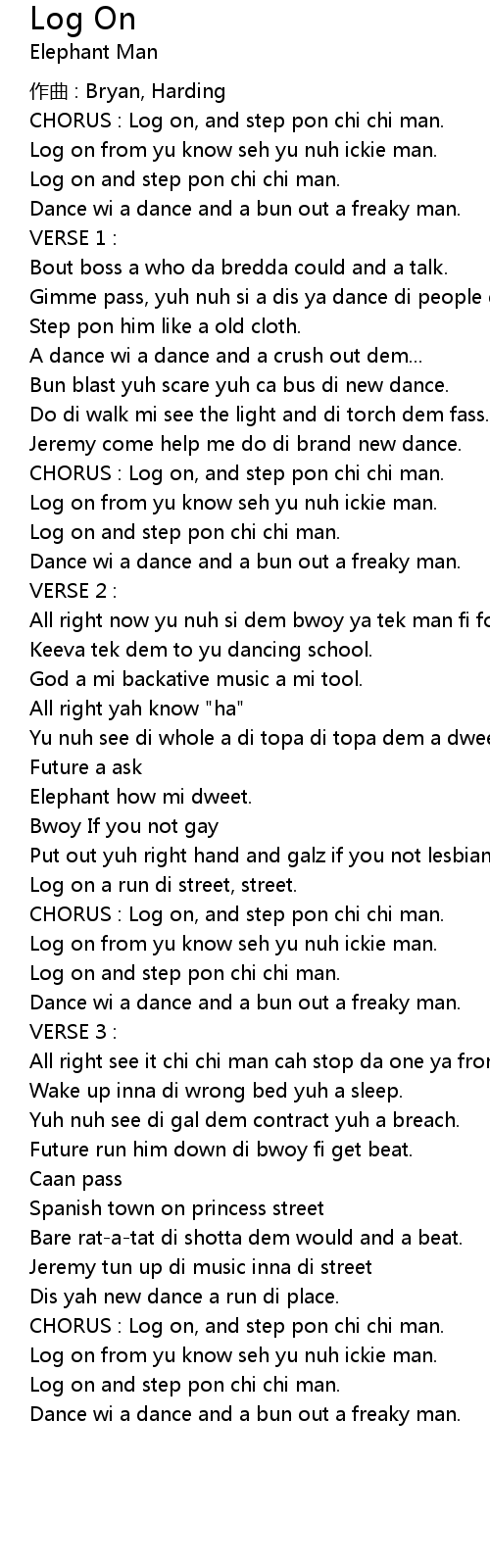 | CHORUS : Log on, and step pon chi chi man. | |