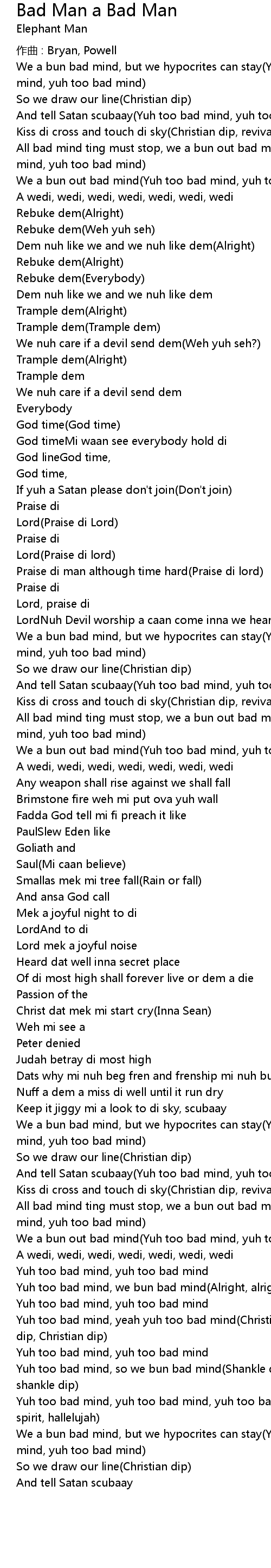 | Yuh too bad mind, we bun bad mind(Alright, alright, Christian dip) | |