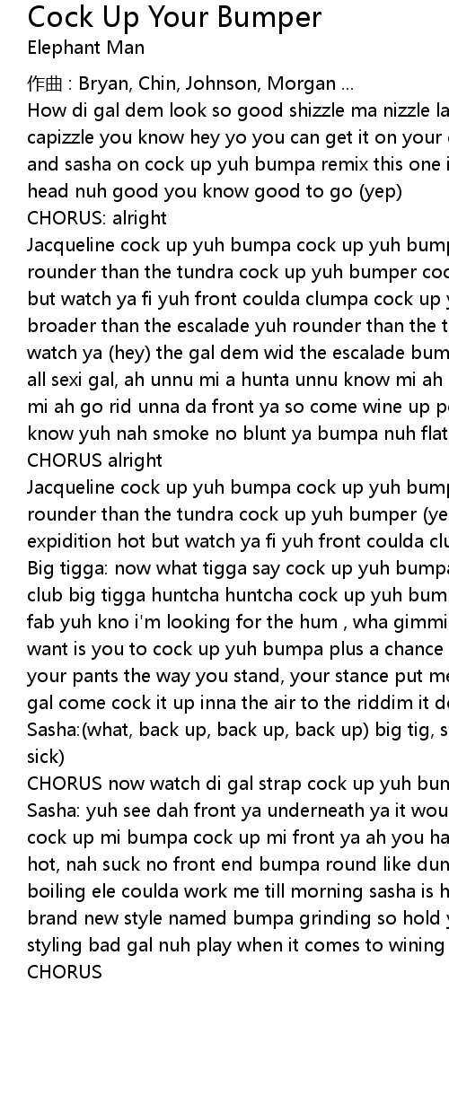 | Jacqueline cock up yuh bumpa cock up yuh bumpa yuh broader than the escalade yuh rounder than the tundra cock up yuh bumper yeah cock up yuh bumper yeah the expidition hot but watch ya fi yuh front coulda clumpa | |