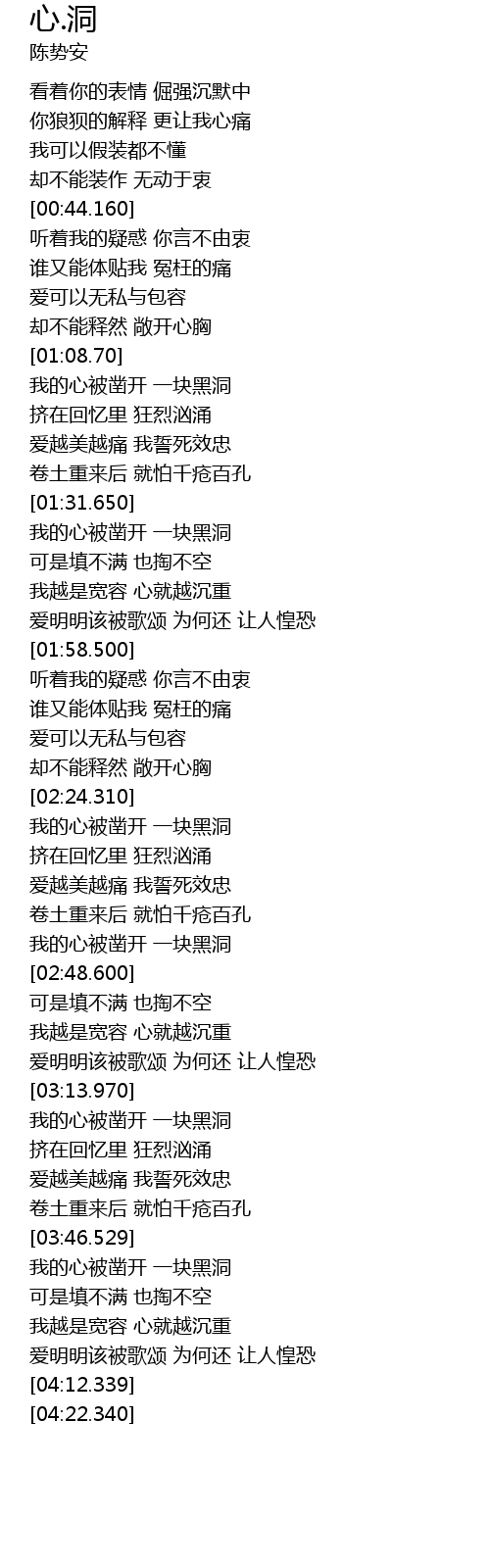 | [03:23.9] | 我的心被凿开 一块黑洞 |