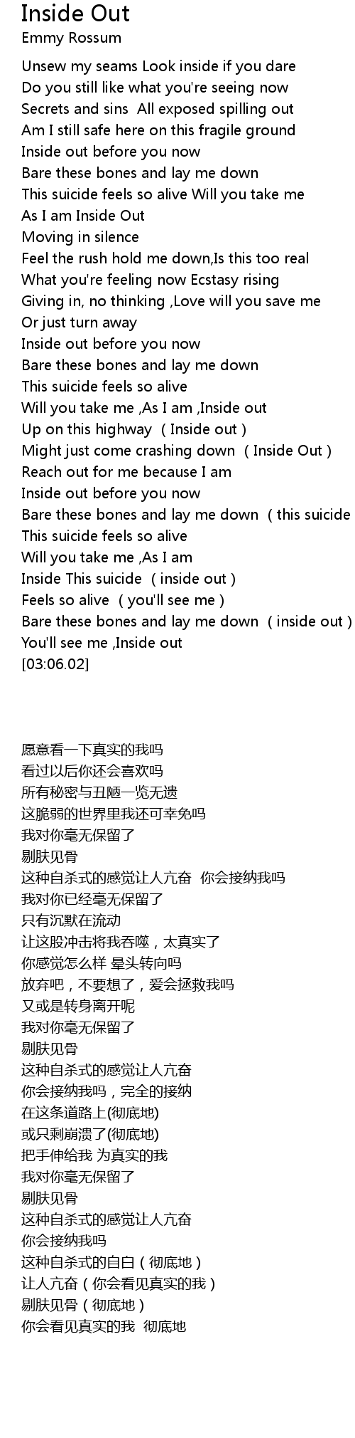| [01:58.91] | Might just come crashing down (Inside Out) |