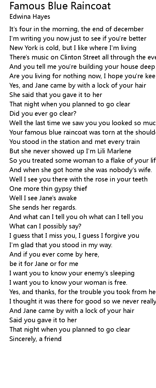 Your famous blue raincoat was torn at the shoulder |
