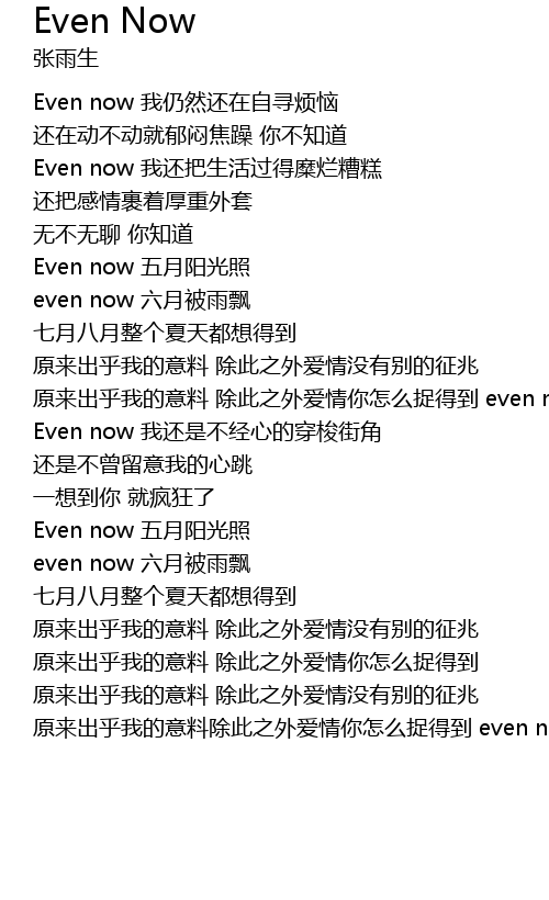 | [01:25.77] | 原来出乎我的意料 除此之外爱情你怎么捉得到 even now |