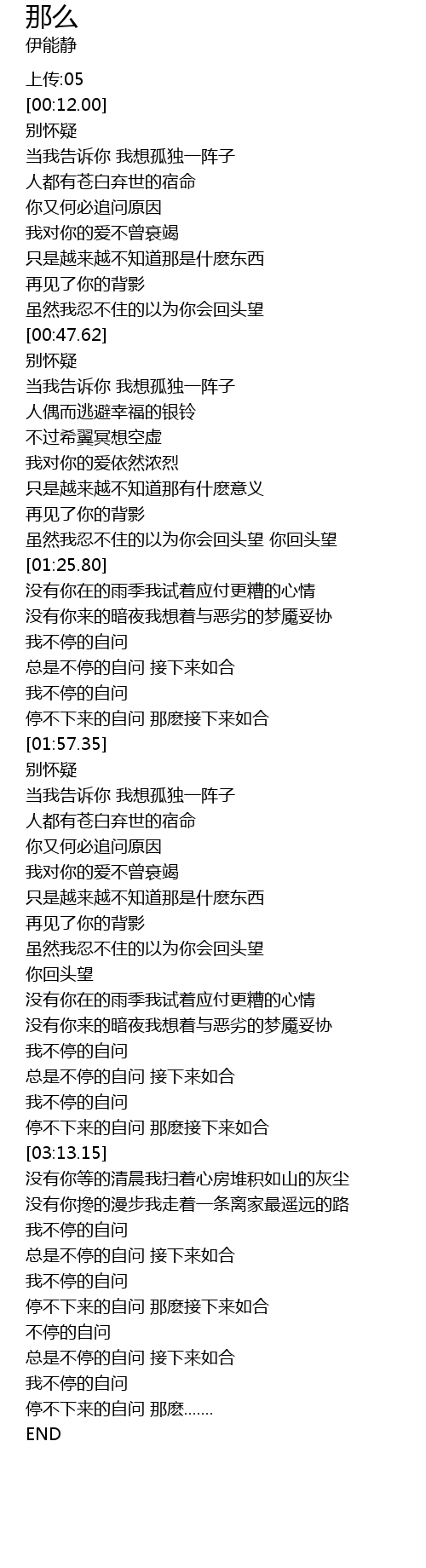 | [03:00.93] | 总是不停的自问 接下来如合 |