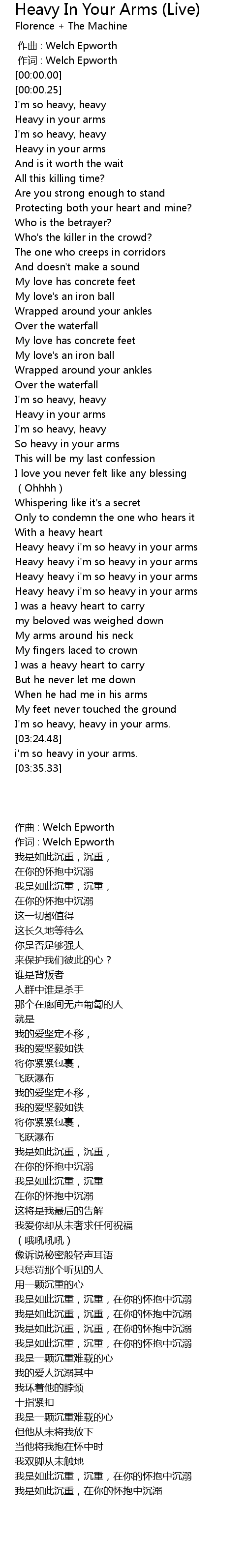 | [02:38.82] | Heavy heavy i' m so heavy in your arms |