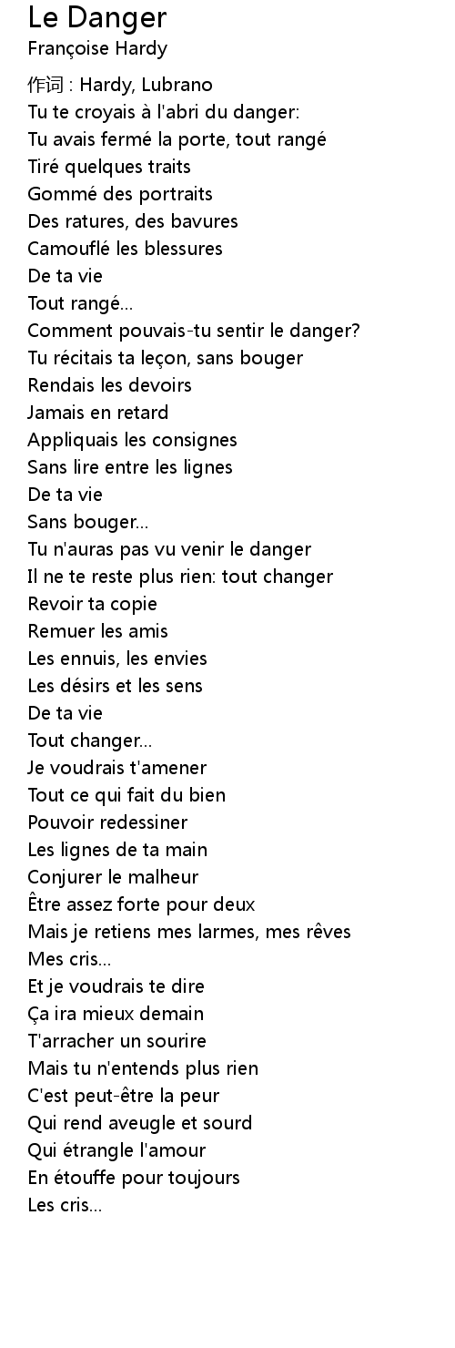 | Tu te croyais a l' abri du danger: | |