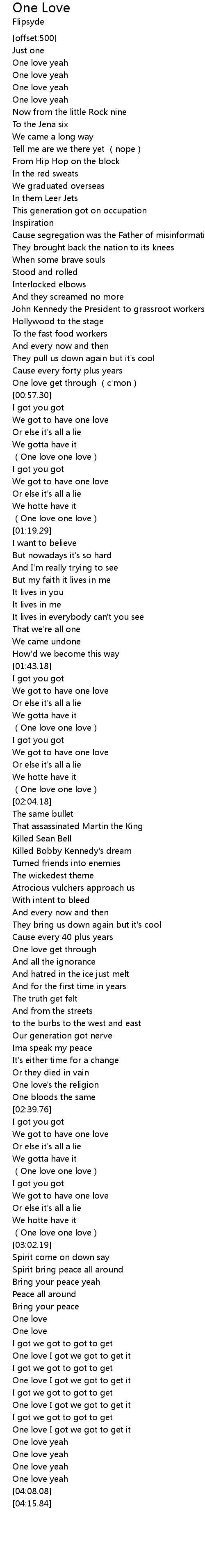 | [00:58.93] | We got to have one love |