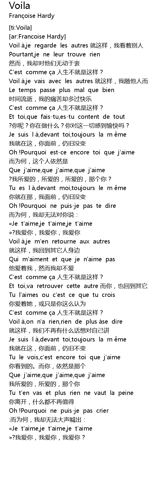 | [01:51.332] | Qui m'aiment et que je n'aime pas 他爱着我,然而我却不爱 |