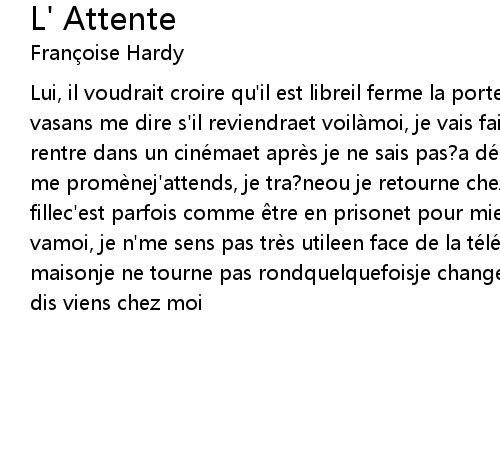 | [00:08.15] | Lui, il voudrait croire qu' il est libreil ferme la porte et s' en vasans me dire s' il reviendraet voila moi, je vais faire un tour en villeje rentre dans un cine maet apre s je ne sais pas? a de pend des foisquelquefoisje me prome nej' attends, je tra? neou je retourne chez moilui, il croit qu' aimer une fillec' est parfois comme tre en prisonet pour mieux voir l' horizonil s' en vamoi, je n' me sens pas tre s utileen face de la te le visiontoute seule a la maisonje ne tourne pas rondquelquefoisje change les drapsj' appelleuntelet lui dis viens chez moi |