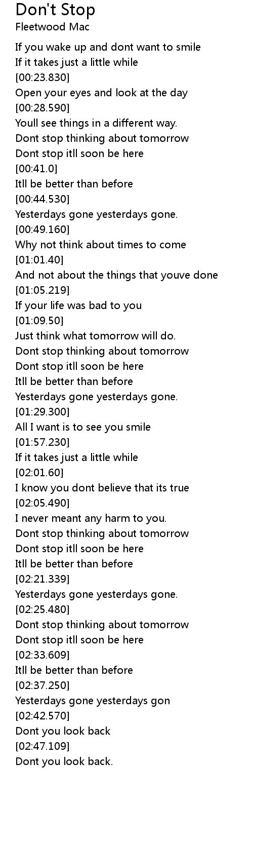 | [01:13.640] | Dont stop thinking about tomorrow |