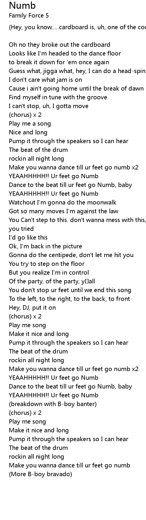 | Dance to the beat till ur feet go Numb, baby | |