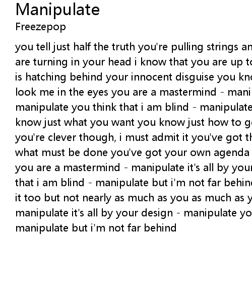 you tell just half the truth you're pulling strings and pushing buttons wheels are turning in your head i know that you are up to something in your mind a plan is hatching behind your innocent disguise you know i'm onto you so you won't look me in the eyes you are a mastermind - manipulate it's all by your design - manipulate you think that i am blind - manipulate but i'm not far behind you know just what you want you know just how to get it you are far too devious you're clever though, i must admit it you've got that killer instinct you do what must be done you've got your own agenda you're looking out for number one you are a mastermind - manipulate it's all by your design - manipulate you think that i am blind - manipulate but i'm not far behind i'm not perfect, i've done it too but not nearly as much as you as much as you you are a mastermind - manipulate it's all by your design - manipulate you think that i am blind - manipulate but i'm not far behind