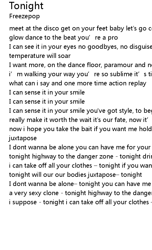 | I dont wanna be alone you can have me for your own you' re a very sexy clone tonight highway to the danger zone tonight drink a bottle of merlot tonight i can take off all your clothes tonight if you want me hold me close tonight will our our bodies juxtapose tonight | |