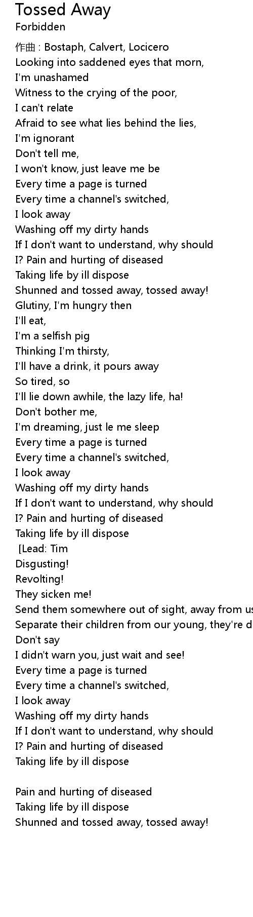 | Shunned and tossed away, tossed away! | |