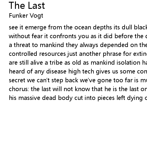 see it emerge from the ocean depths its dull black eyes staring into yours without fear it confronts you as it did before the dawn of man overpopulation is a threat to mankind they always depended on the same food some may call it controlled resources just another phrase for extinction deep in the forest they are still alive a tribe as old as mankind isolation has kept them alive never heard of any disease high tech gives us some control revealing even the latest secret we can't step back we've gone too far is much to late for revelation chorus: the last will not know that he is the last only we will mourn his loss his massive dead body cut into pieces left dying on the moss |