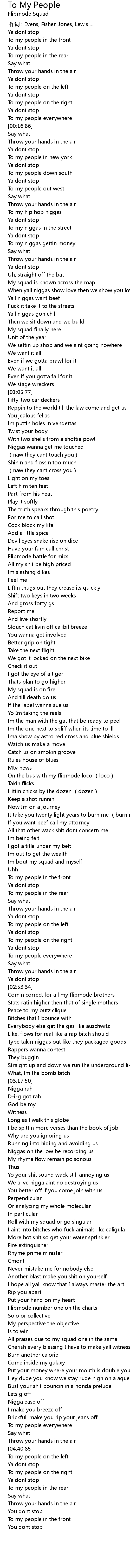 | [04:15.83] | All praises due to my squad one in the same |
