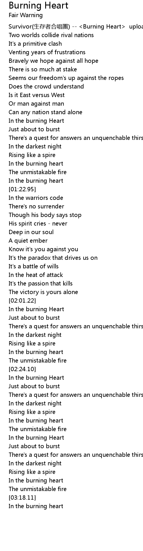 | [00:00.00] | Survivor(生存者合唱團) -- <Burning Heart> upload by Giga97 |