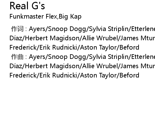 | [00:00.000] | 作词 : Ayers/Snoop Dogg/Sylvia Striplin/Etterlene Jordan/Luis Díaz/Herbert Magidson/Allie Wrubel/James Mtume/Mark DeBarge/Calente Frederick/Erik Rudnicki/Aston Taylor/Beford |