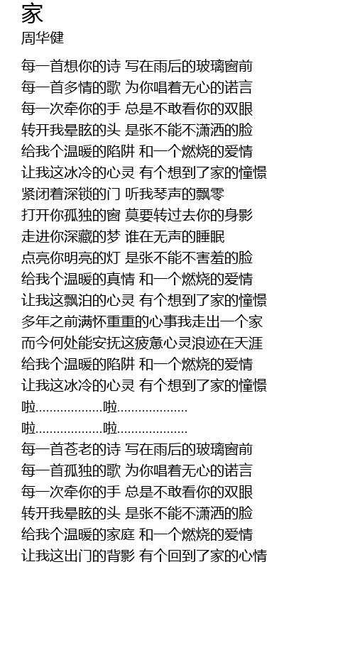 | [04:11.250] | 让我这出门的背影 有个回到了家的心情 |