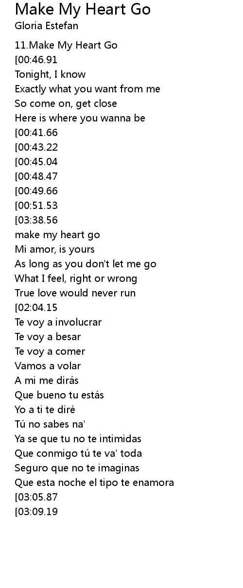 | [03:45.31][03:38.56][03:31.63][03:24.87][02:30.24][02:23.10][02:16.30][02:09.36][01:21.38][01:14.44][01:07.65][01:00.85] | You make my heart go |