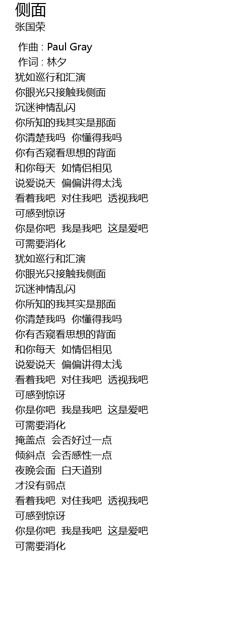 | [01:19.297] | 你眼光只接触我侧面 |