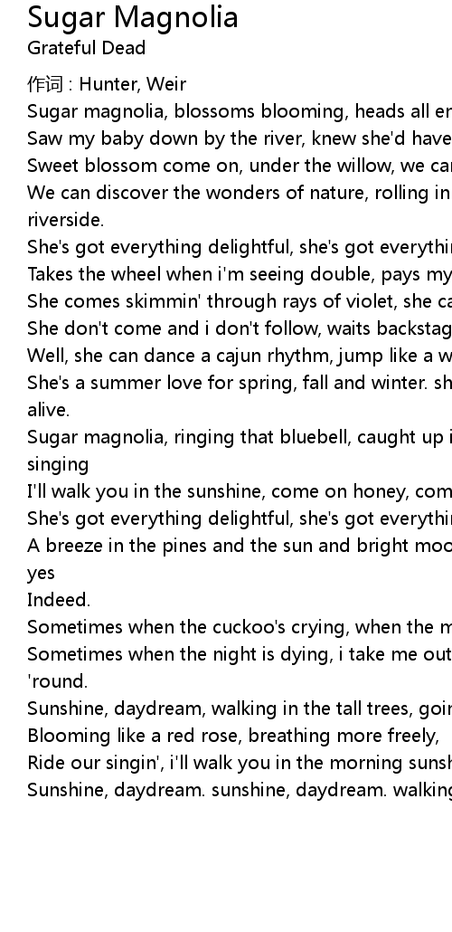 | Sugar magnolia, blossoms blooming, heads all empty and i don' t care, | |