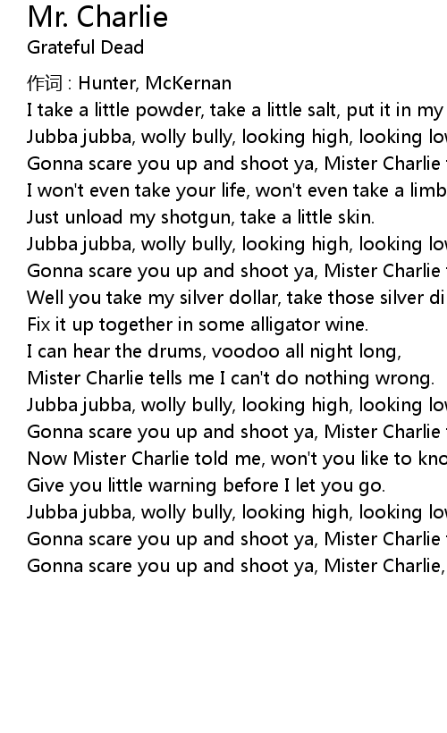 | Gonna scare you up and shoot ya, Mister Charlie, Mister Charlie told me so |