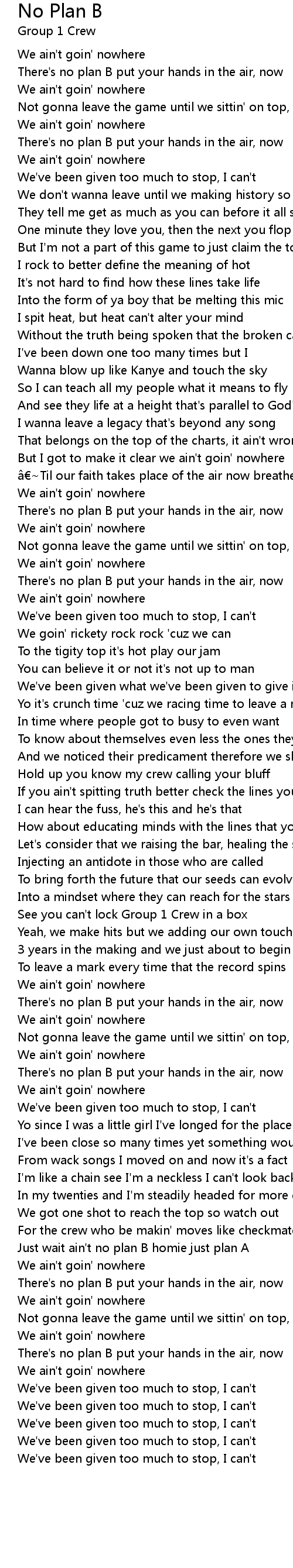 | Just wait ain' t no plan B homie just plan A | |