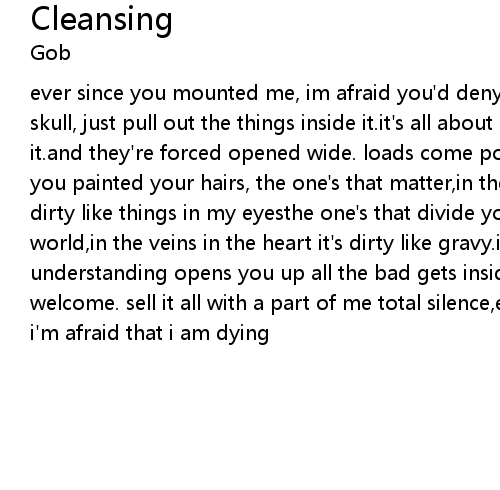 | ever since you mounted me, im afraid you'd deny it.you never need to break the skull, just pull out the things inside it.it's all about me i can't escape it.and they're forced opened wide. loads come pouring on everything,on your body you painted your hairs, the one's that matter,in the veins in the heart it's dirty like things in my eyesthe one's that divide you. i can see around the world,in the veins in the heart it's dirty like gravy.i've got problems. understanding opens you up all the bad gets inside you.all emotions will be welcome. sell it all with a part of me total silence,ever since you mounted me i'm afraid that i am dying |