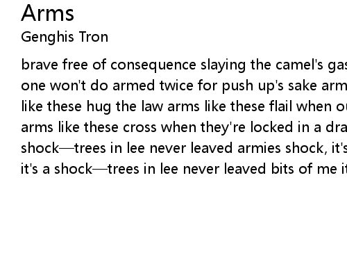 | brave free of consequence slaying the camel' s gash pine marks his passing well one won' t do armed twice for push up' s sake arms like these swing a state arms like these hug the law arms like these flail when our songs hit a desert bride arms like these cross when they' re locked in a draped pine box shock, it' s a shock trees in lee never leaved armies shock, it' s a shock these trees shock, it' s a shock trees in lee never leaved bits of me it' s a shock, it' s a shock |