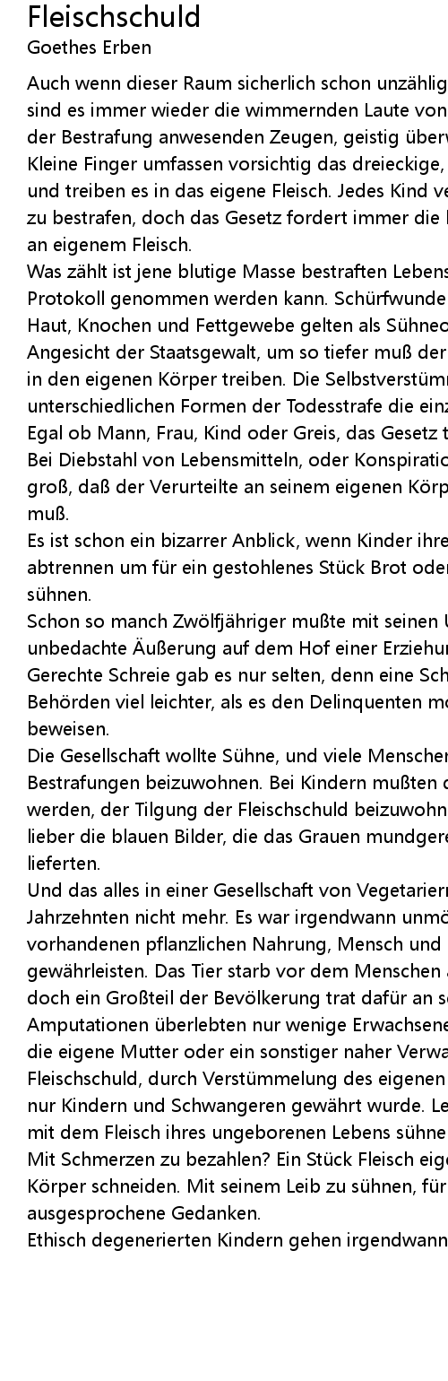 | Die Gesellschaft wollte Sühne, und viele Menschen genossen es sogar, den Bestrafungen beizuwohnen. Bei Kindern mußten die Menschen fast immer gezwungen werden, der Tilgung der Fleischschuld beizuwohnen. Die Menschen betrachteten lieber die blauen Bilder, die das Grauen mundgerecht und steril frei Haus lieferten. | |