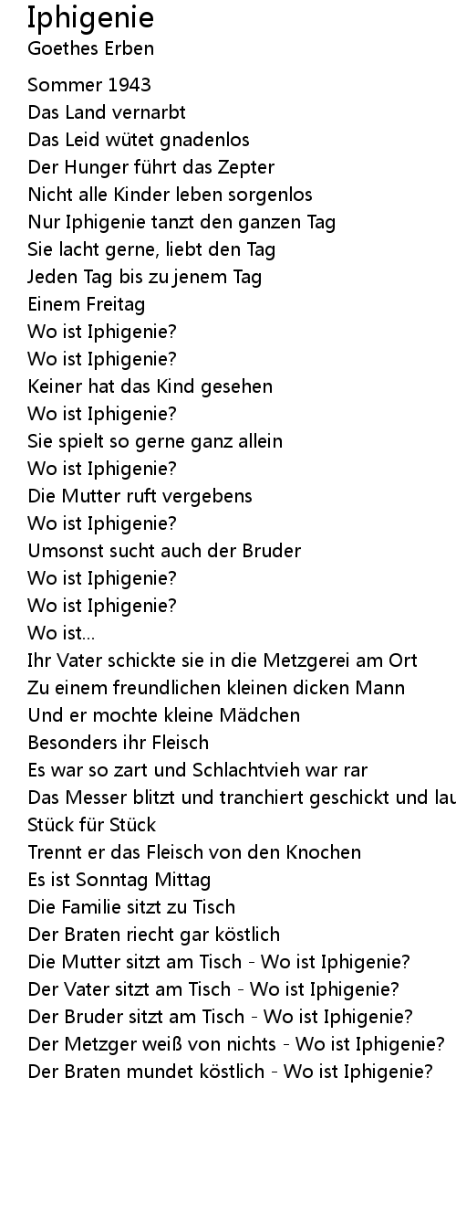 | Der Metzger wei von nichts Wo ist Iphigenie? | |