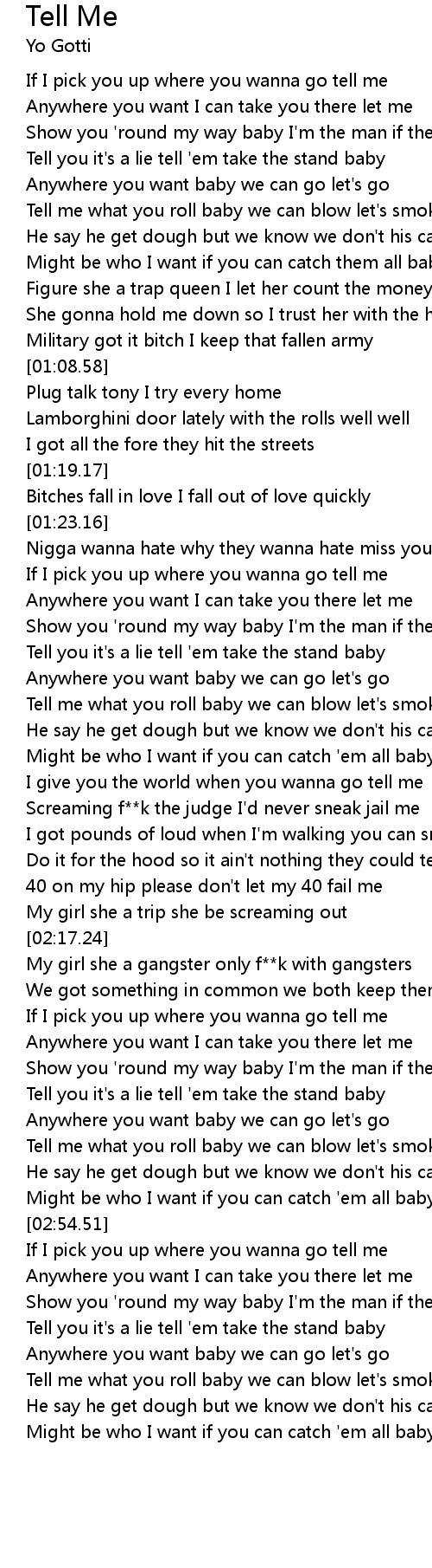 | [02:25.74] | If I pick you up where you wanna go tell me |