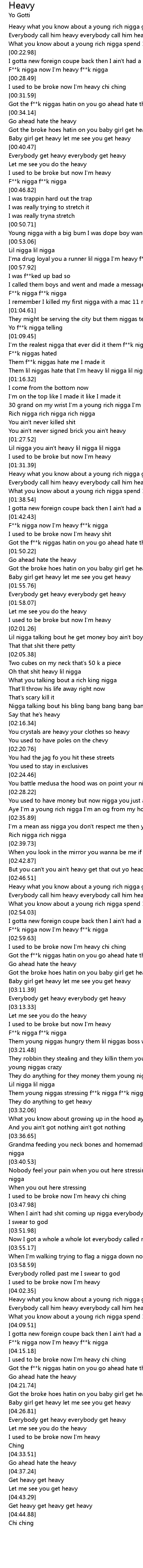 | [00:55.14] | I'ma drug loyal you a runner lil nigga I'm heavy f**k nigga f**k nigga |