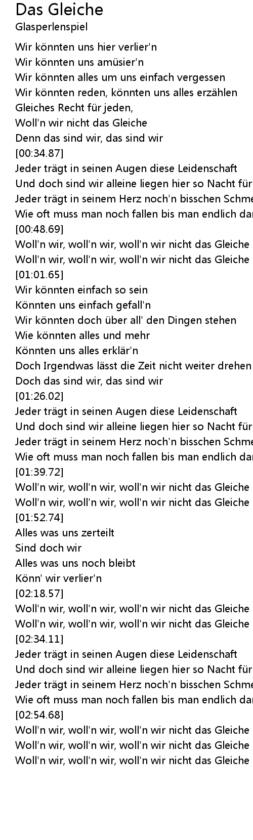 | [03:01.76] | Woll'n wir, woll'n wir, woll'n wir nicht das Gleiche |