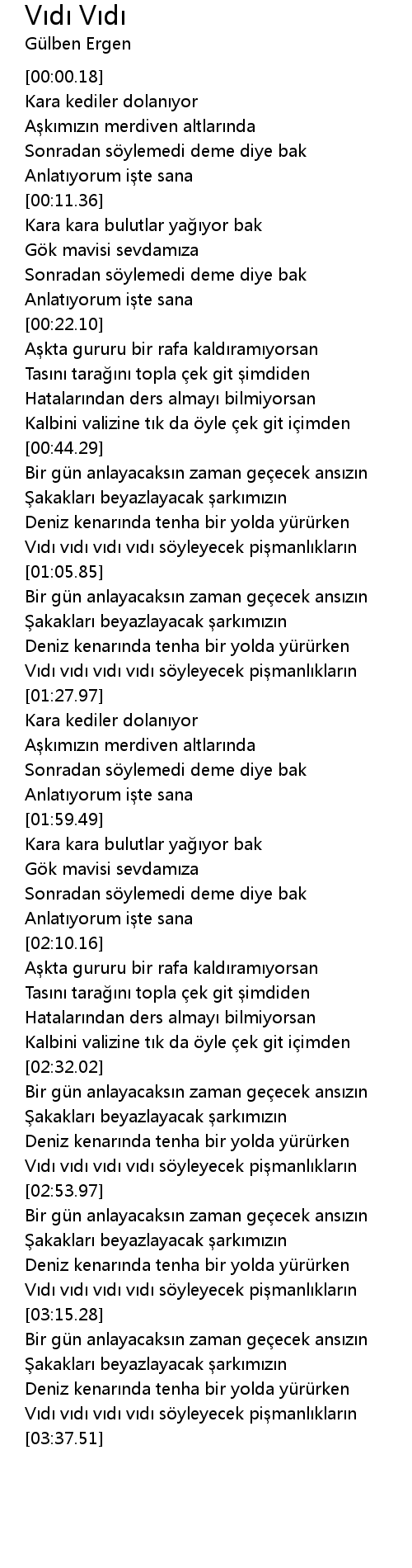 | [03:10.43] | Vıdı vıdı vıdı vıdı söyleyecek pişmanlıkların |