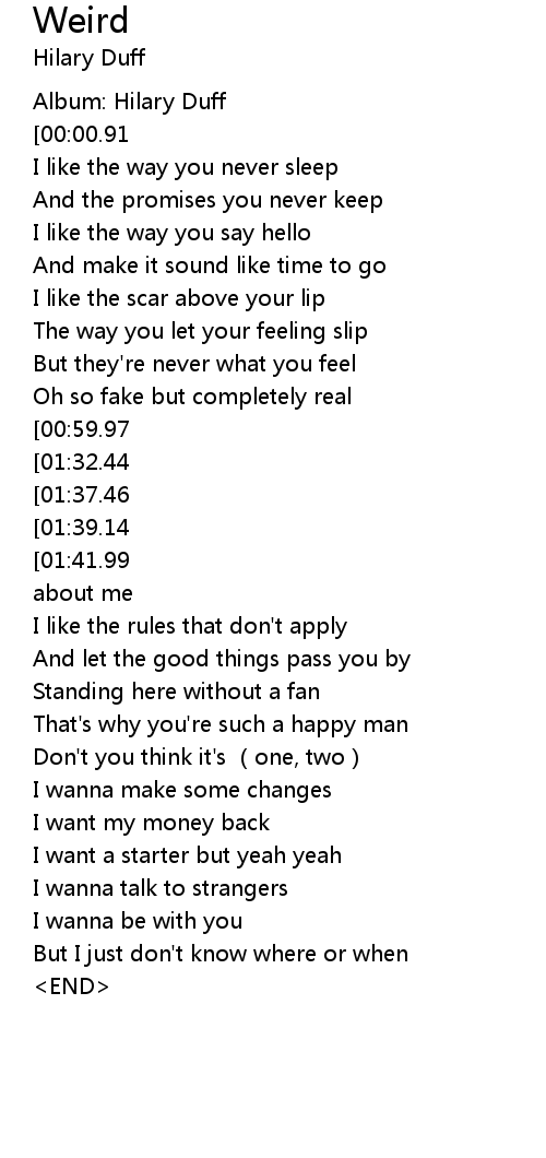 | [00:44.65][01:32.44][02:34.12] | Weirder than weird |