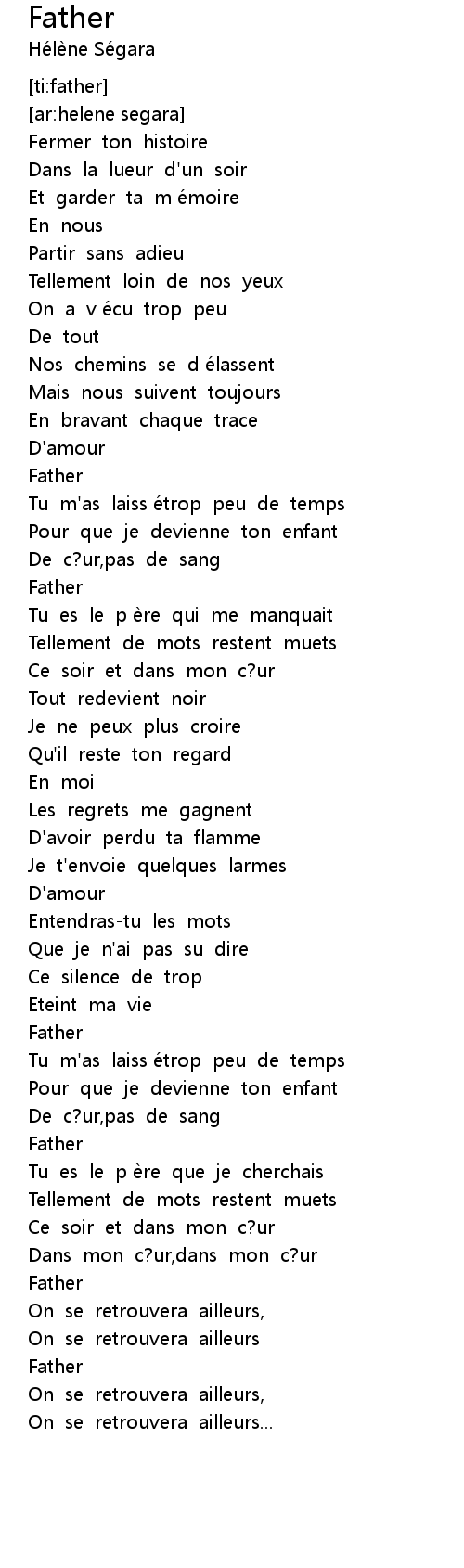 | [02:42.550] | Tu es le p è re que je cherchais |