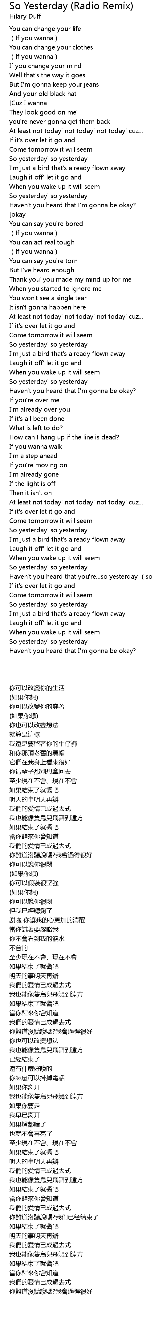 | [02:59.400] | Haven' t you heard that you' re... so yesterday so yesterday |