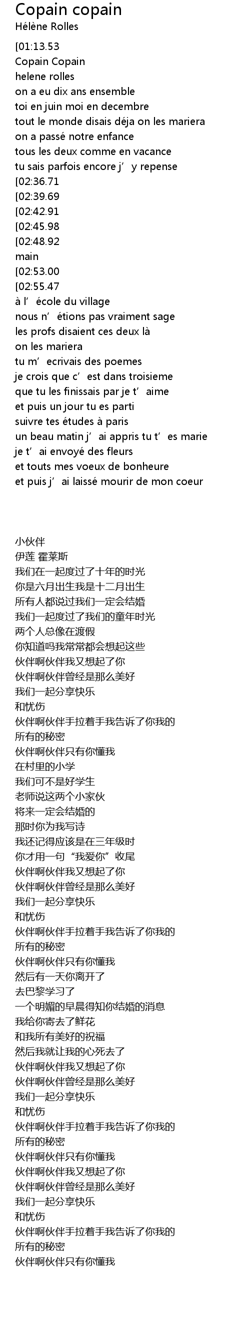 | [03:13.37][02:48.92][01:54.05][01:01.95] | copain copain je te disais main dans la main |