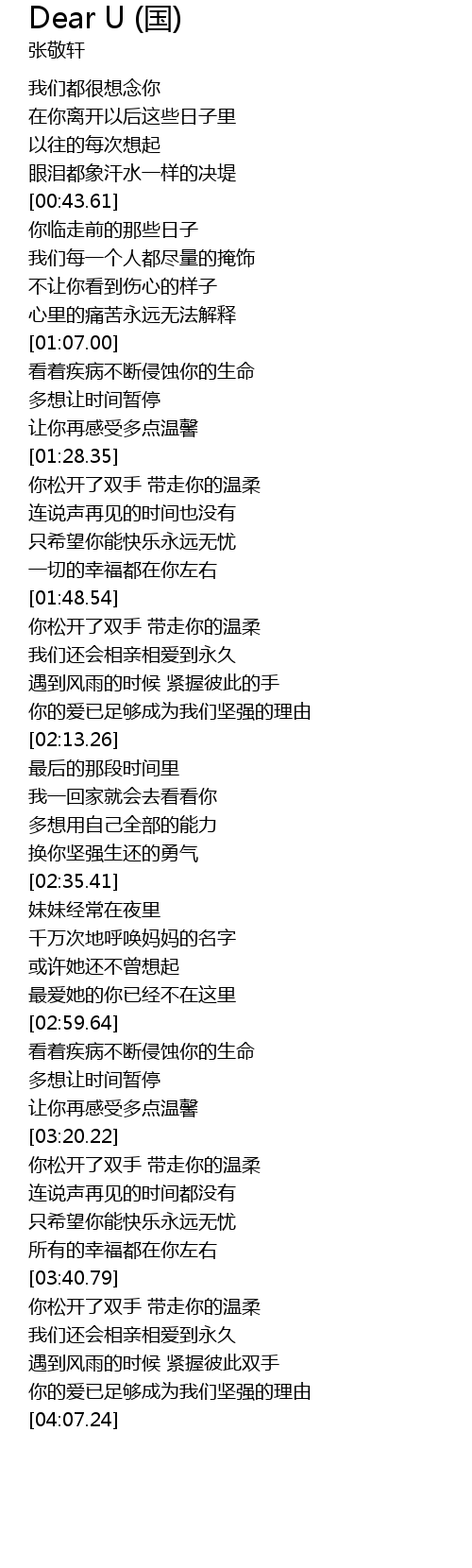 | [03:57.98] | nǐ de ài yǐ zú gòu chéng wéi wǒ men jiān qiáng de lǐ yóu |