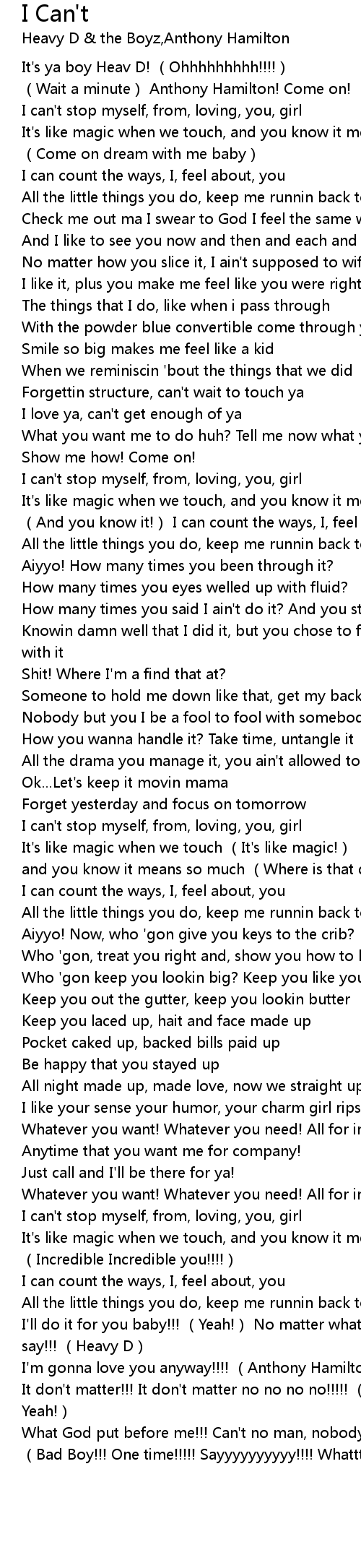 | [03:24.41] | I'll do it for you baby!!! (Yeah!) No matter what the people say!!! (Heavy D) |