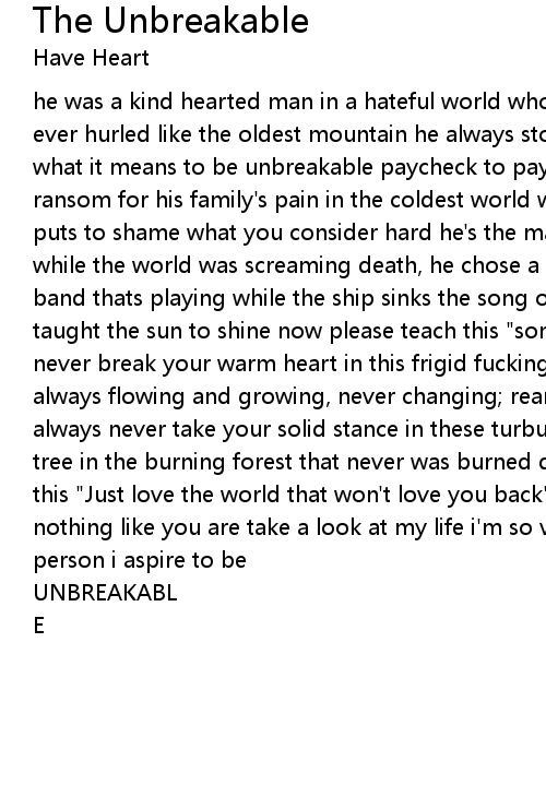 he was a kind hearted man in a hateful world who caught every thing that life ever hurled like the oldest mountain he always stood so tall forever showing what it means to be unbreakable paycheck to paycheck, 3 jobs a day, he's the ransom for his family's pain in the coldest world with the warmest heart, he puts to shame what you consider hard he's the man you don't see in the mirror while the world was screaming death, he chose a different song to hear he's the band thats playing while the ship sinks the song of hope, he forever sings he taught the sun to shine now please teach this "son" to shine how can this world never break your warm heart in this frigid fucking place? you're like the river: always flowing and growing, never changing; rearranging how can this world always never take your solid stance in these turbulent time? you're like the tree in the burning forest that never was burned down and what he said to me was this "Just love the world that won't love you back" old man look at my life i'm nothing like you are take a look at my life i'm so very fucking far from the person i aspire to be |