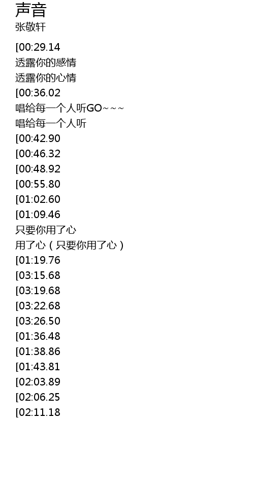 | [04:04.55][02:11.18] | yào nǐ yòng xīn líng tīng yòng zhēn xīn gǎn yìng |