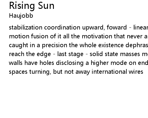 | stabilization coordination upward, foward - linear no compromise acceleration of motion fusion of it all the motivation that never arrives sharp - edged visions caught in a precision the whole existence dephrased the inner life of a cage reach the edge - last stage - solid state masses move infected with each other walls have holes disclosing a higher mode on endless tape of time variable spaces turning, but not away international wires |
